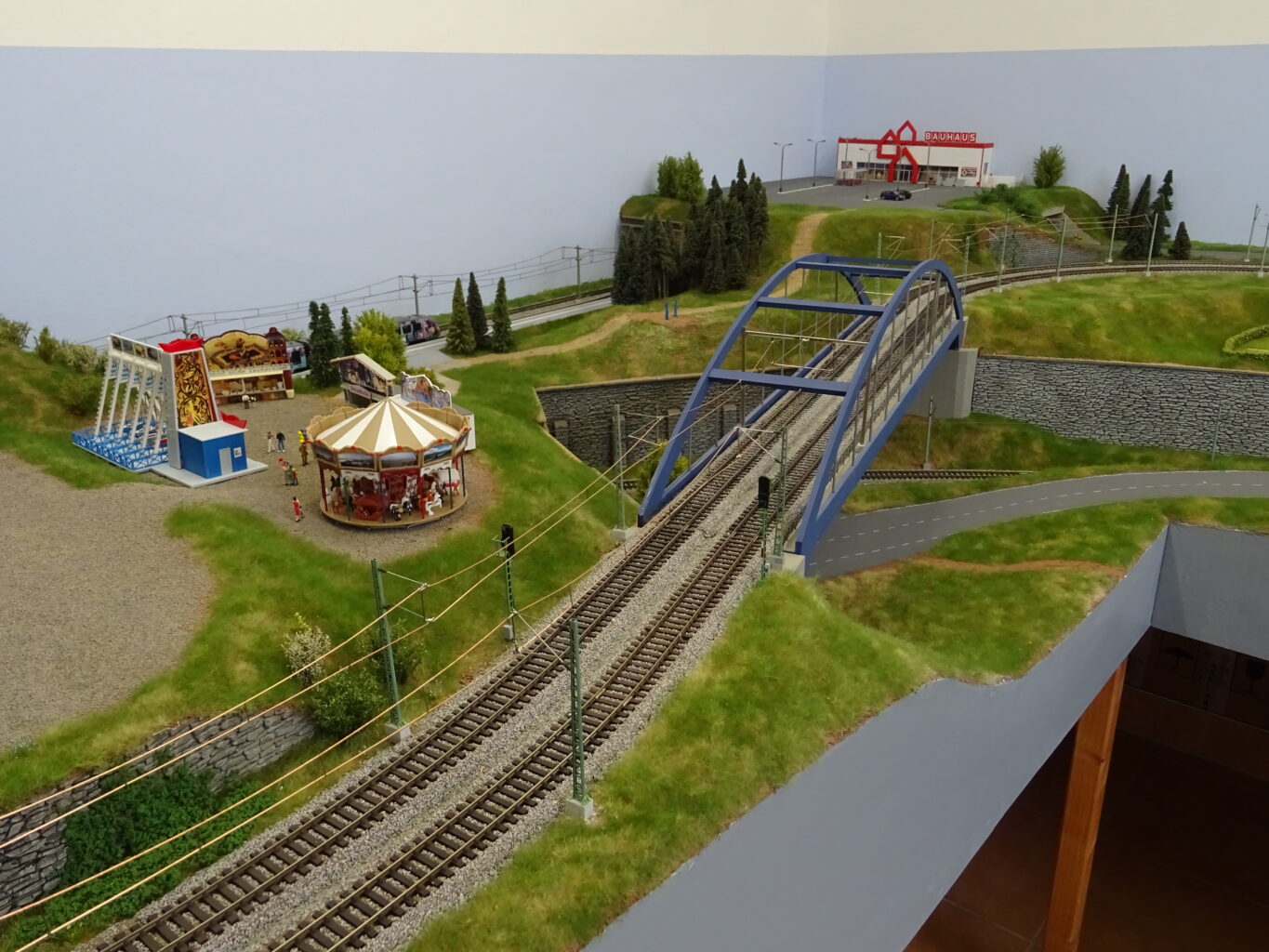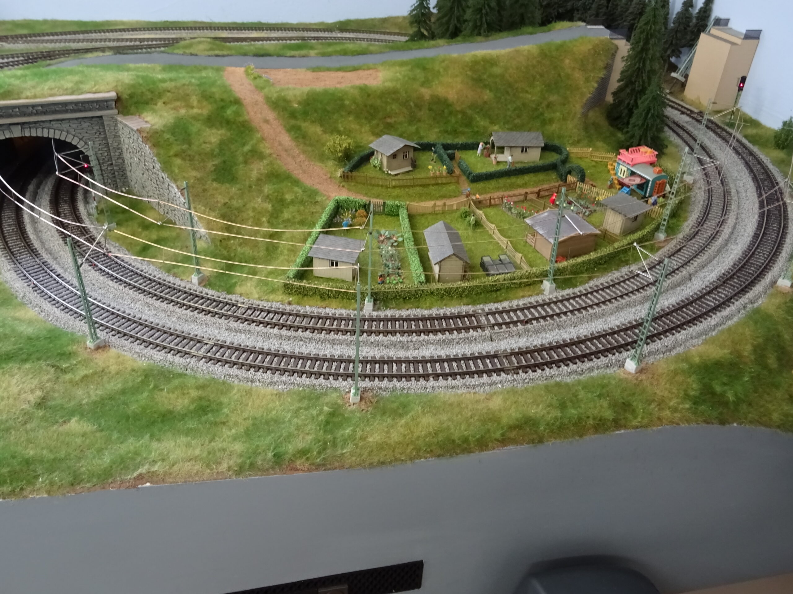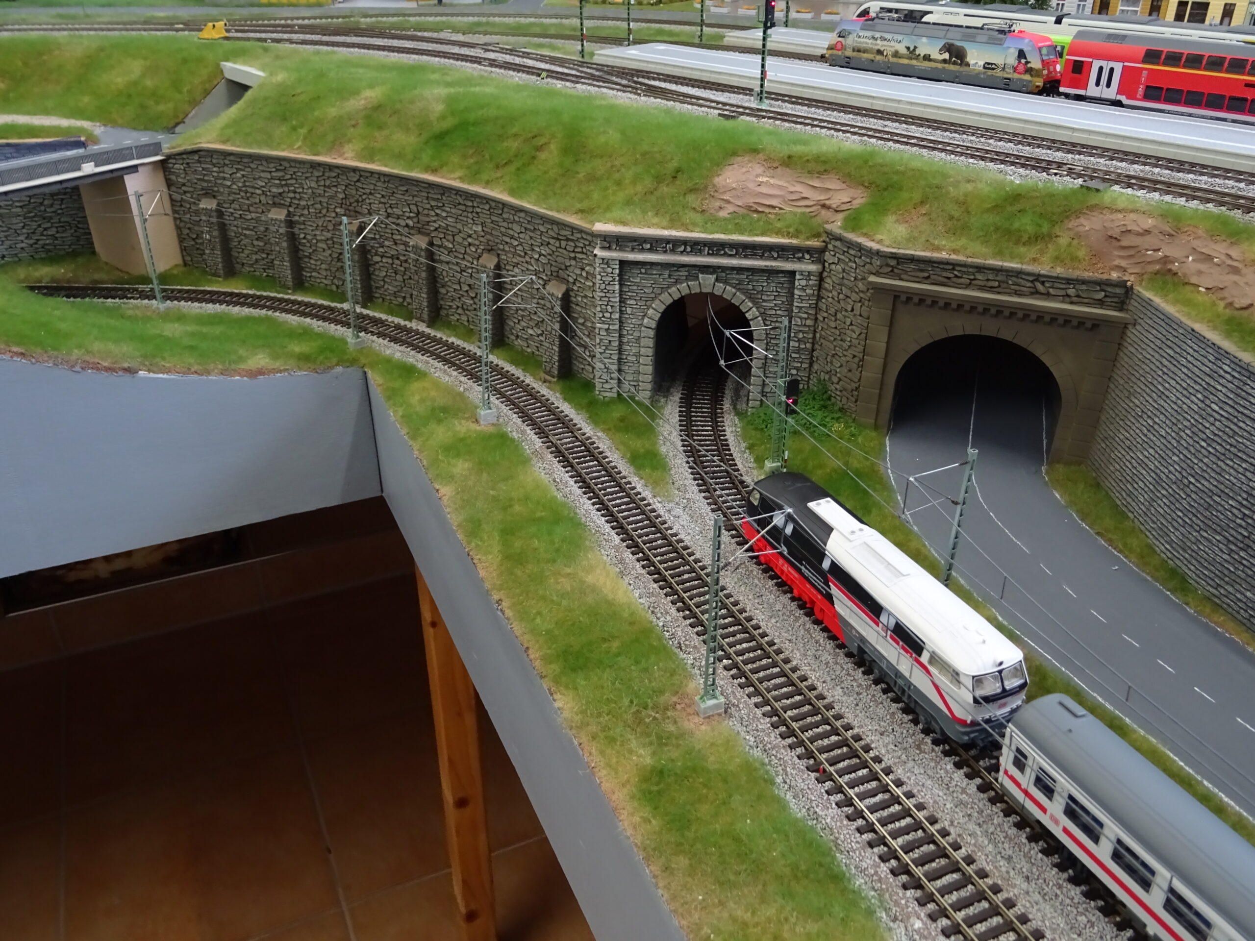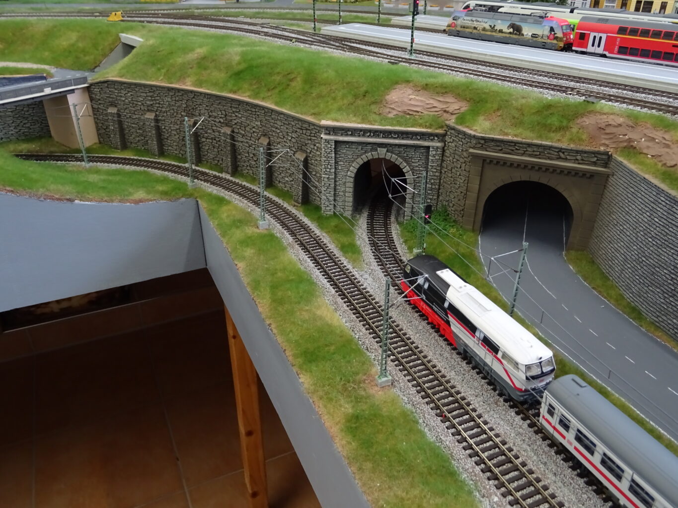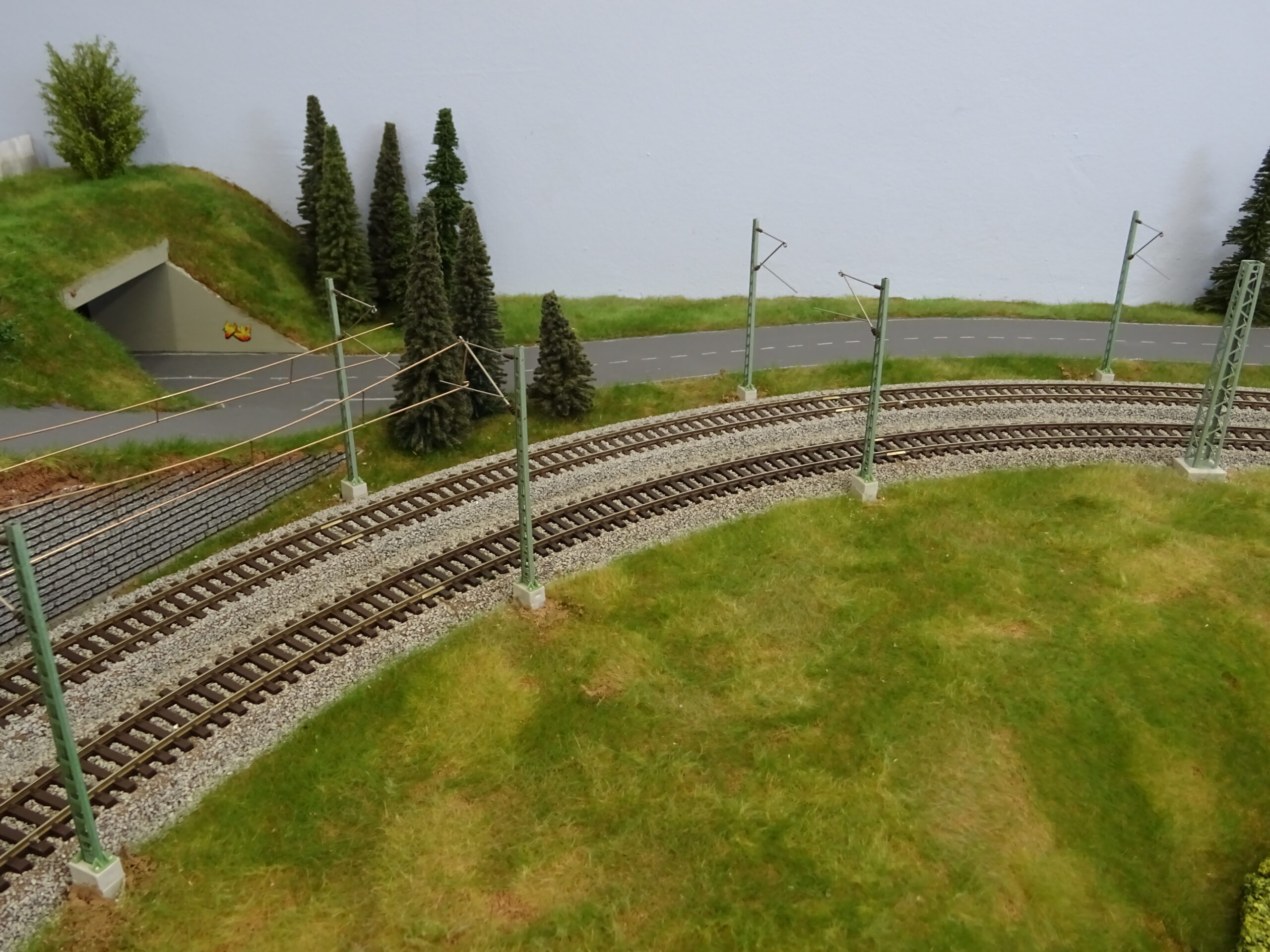 Und ich fahre ja „heute“. Also soll da Oberleitung hin. Das hatte ich im Tunnel und an den Ausfahrten schon vorbereitet. Jetzt habe ich mich aufgerafft und an beiden Seiten weiter gebaut. Auch die untere Strecke wurde bearbeitet und ist auch schon fertig. Nachfolgend ein paar Bilder. An manchen Stellen schon grau angemalt, an derer Stelle noch das blanke Kupfer.